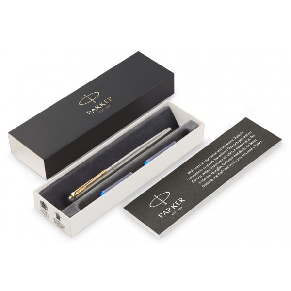 Ручка перьевая Parker JOTTER 17 SS GT FP M 16 012. Металлическая корпусная часть. Полированный метал. Стандартный тип закрытия колпачком, на котором расположено наименование бренда. Фирменная стрелочка покрыта позолотой. Гармоничное сочетание холодного и теплого оттенков. Наименование бренда производителя. Перо белого цвета.