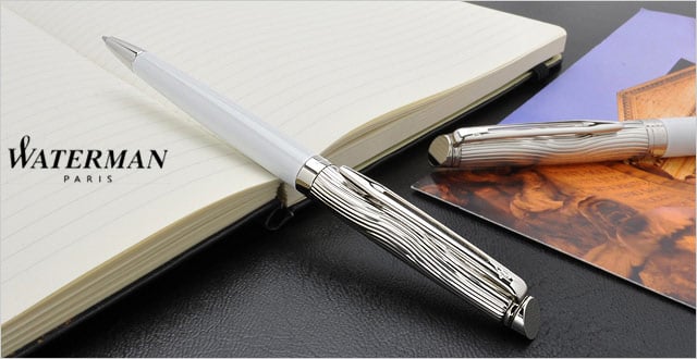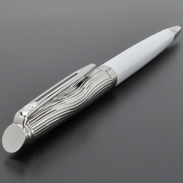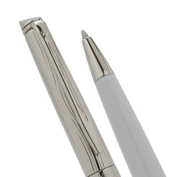 Отделка: многослойное покрытие высококачественным и особо прочным лаком белого цвета, блестящее палладиевое покрытие колпачка, изысканная чеканка волной на колпачке в стиле канонических декоров Waterman, “брендованное кольцо”, отдельные элементы дизайна – зеркальный хром.