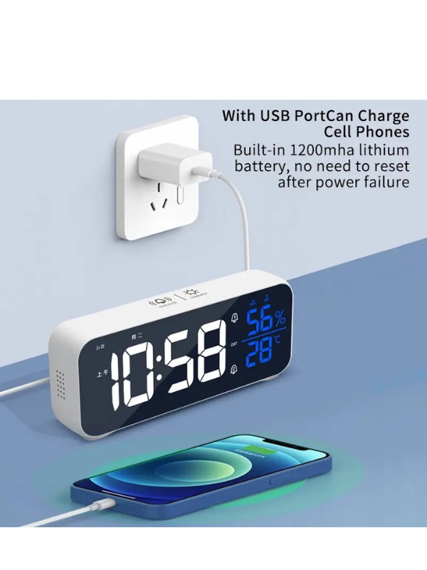 Електронний годинник з LED дисплеєм, з регулюванням яскравості. Відображення температури, вологості, дня тиждня. 1200mAh батарея. Електроживлення від мережі 220Вт , або від внутрішнього акумулятора. Вихід USB для зарядки телефона 5V/2А. Два будильника. 18 мелодій будильника. 12/24.
