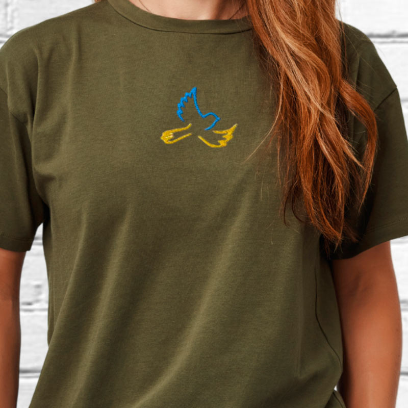 Жіноча футболка з вишивкою голуба миру в кольорах прапору України. Тканина м'яка і приємна. Він виготовлений зі 100% бавовни. Футболка має круглий виріз. Ідеально підходить для повсякденного носіння і поєднується з джинсами, брюками, шортами. Така футболка при правильному догляді прослужить довго і може використовуватися цілий рік. Ви можете обрати футболку з представлених кольорів сорочки та кольору вишивки. Розмірна сітка показанана разом з фото. Якщо потрібен інший розмір, задавайте питання, запропонуємо варіанти. ДОГЛЯД: - Машинне або ручне прання при +40°C в делікатному режимі. Сильно не скручувати, не розтягувати. Не можна сильно терти і використовувати відбілюючі засоби. - Після прання футболку слід ретельно висушити. Не сушіть його під прямими сонячними променями. - Щоб не пошкодити вишивку на футболці, під час прасування рекомендується використовувати прасувальну дошку та парову праску. Ми будемо раді відповісти на ваші запитання. Не пропустіть нашу ексклюзивну пропозицію!